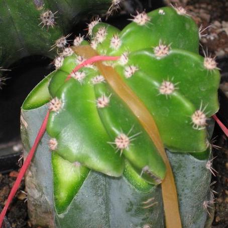 und mit je zwei Areolen auf die Unterlagen gepfropft. Hierbei geht kein Teil der Kakteen verloren.